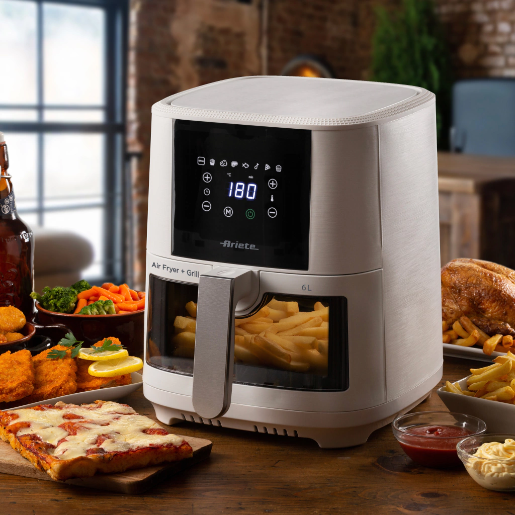 Con la freidora de aire Airy Fryer 6L, puedes freír cualquier plato en grandes cantidades, usando solo una cucharada de aceite para obtener una fritura saludable y sabrosa. Gracias a su gran cesta extraíble de 6 L, ¡con la Airy Fryer 6L de Ariete puedes cocinar hasta 2,5 kg de patatas fritas a la vez! Patatas fritas, pero no solo, también croquetas, pescado, carne y muchos otros alimentos empanados, tanto congelados como listos para freír, frescos y recién empanados, gracias a sus 8 programas preestablecidos.